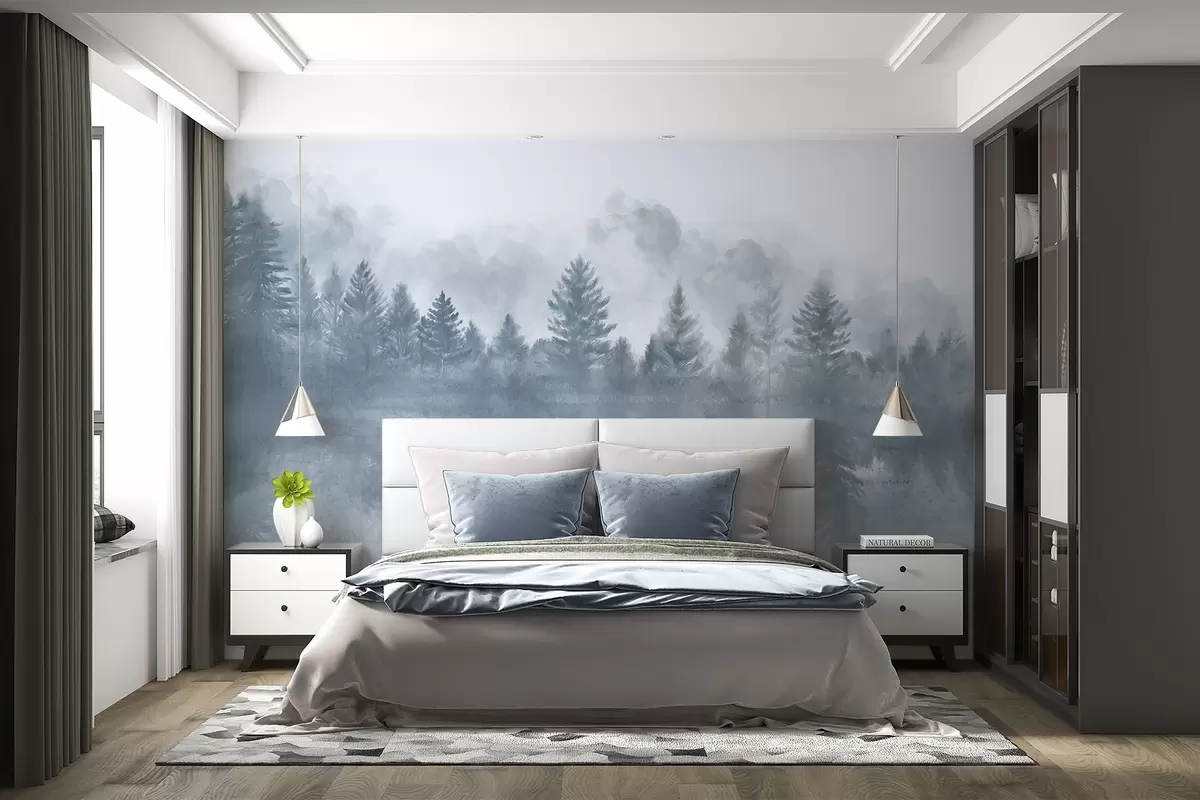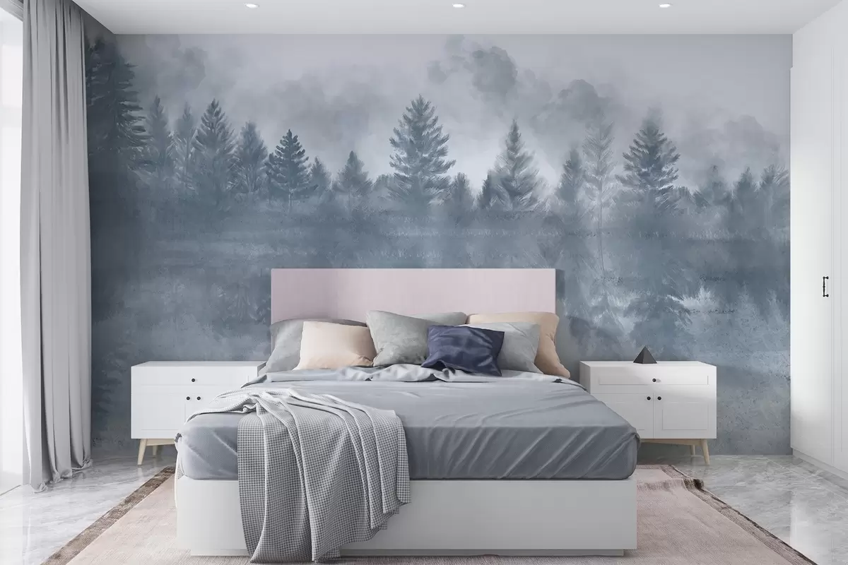 Murais de parede Uma paisagem serena com um lago congelado rodeado por um denso pinhal, com uma atmosfera enevoada e nebulosa Nr. w08415