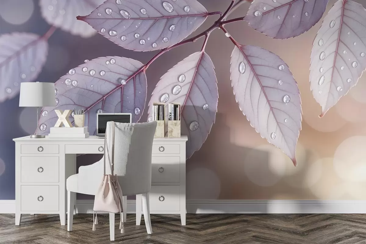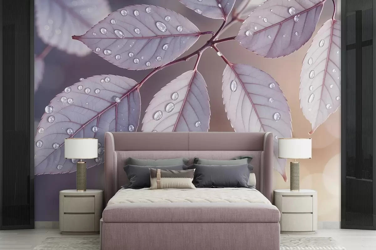 Murais de parede Folhas roxas delicadas com gotas de água, fundo com focagem suave Nr. w08419