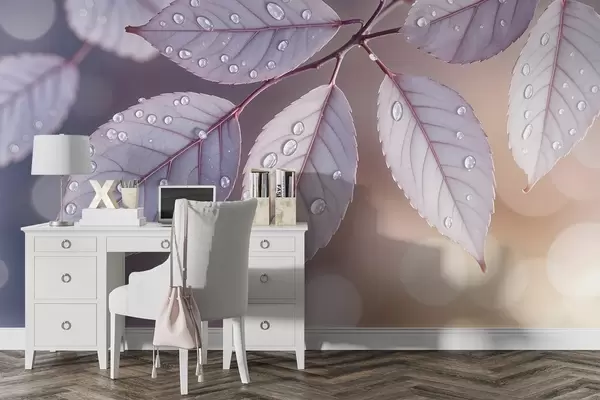 murais de parede Folhas roxas delicadas com gotas de água, fundo com focagem suave w08419