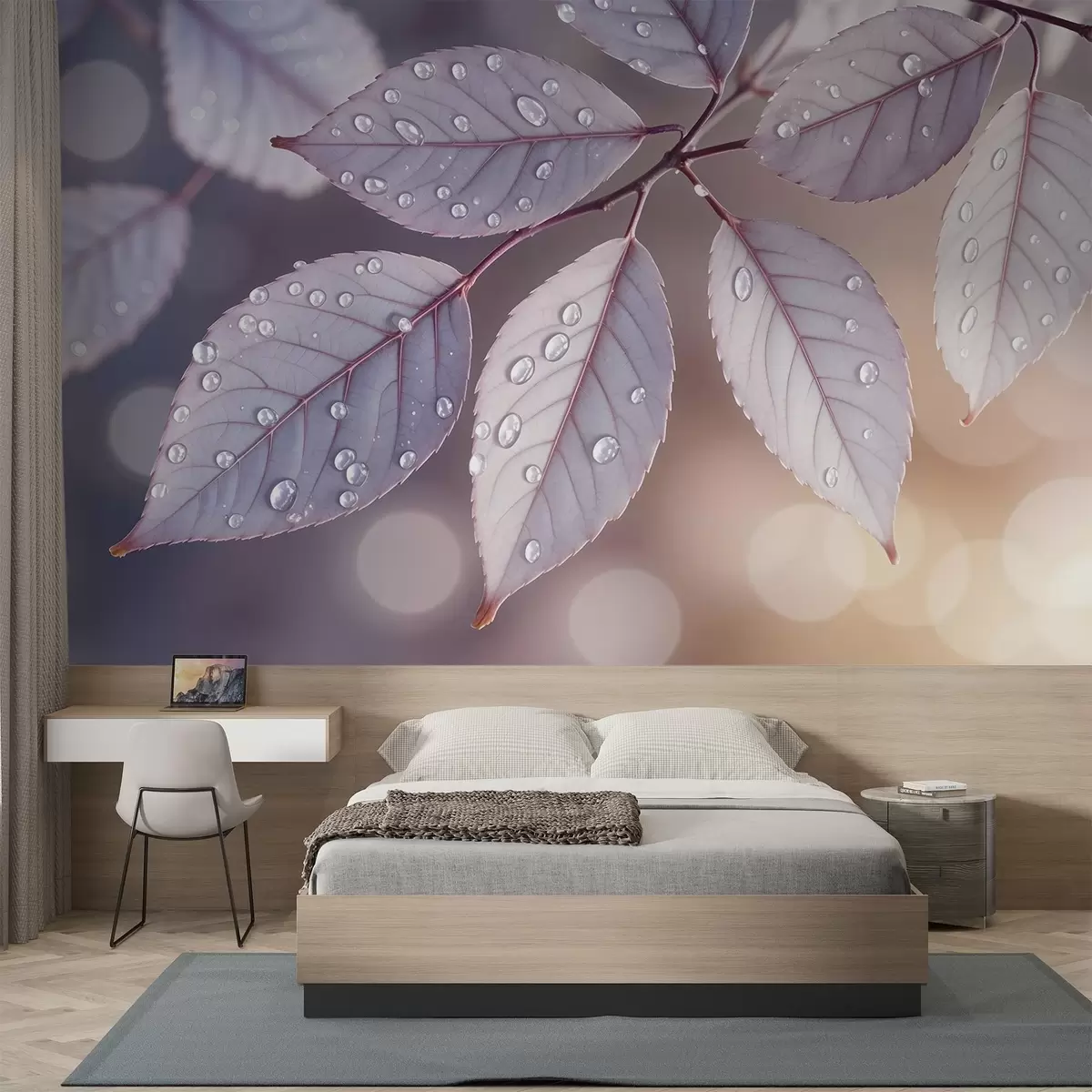 Murais de parede Folhas roxas delicadas com gotas de água, fundo com focagem suave Nr. w08419