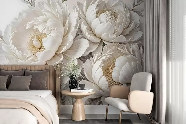Murais de parede Delicadas peónias brancas pastel com folhagem exuberante num fundo suave e neutro Nr. w08420