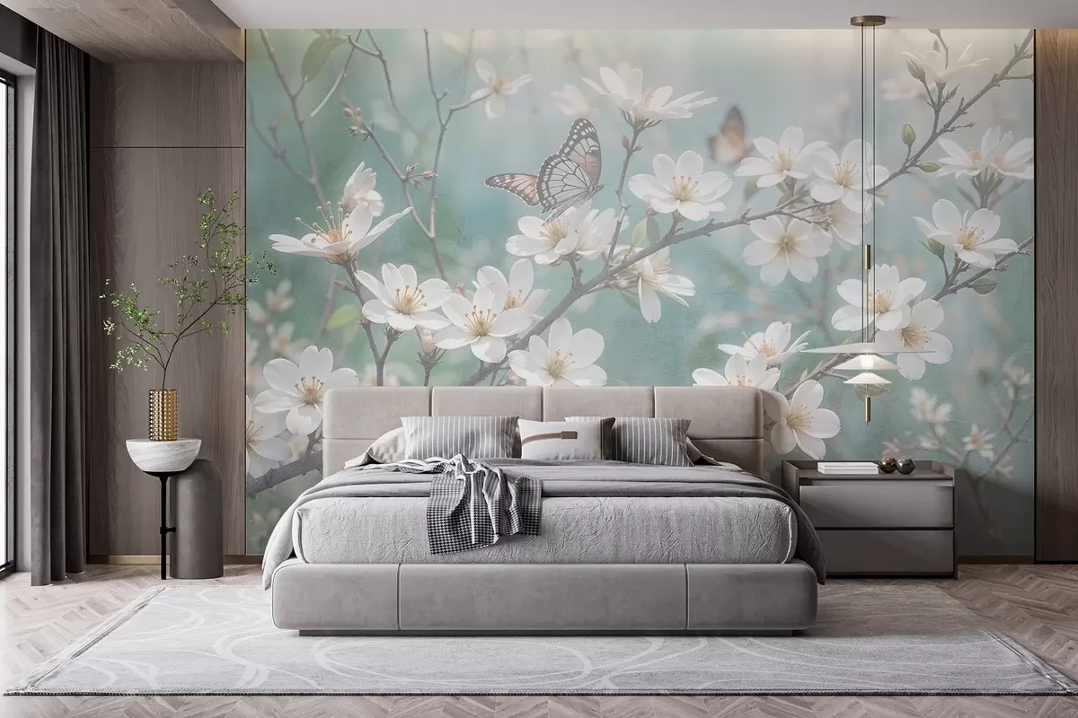 Murais de parede Uma borboleta branca num ramo com delicadas flores de cerejeira brancas em primeiro plano contra um fundo desfocado Nr. w08421