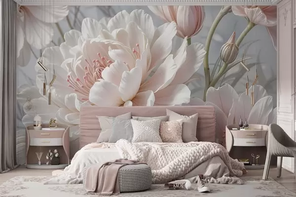 Murais de parede Grandes e delicadas flores de peónia brancas e cor-de-rosa com pétalas macias e fofas sobre um fundo cinzento esbatido Nr. w08427