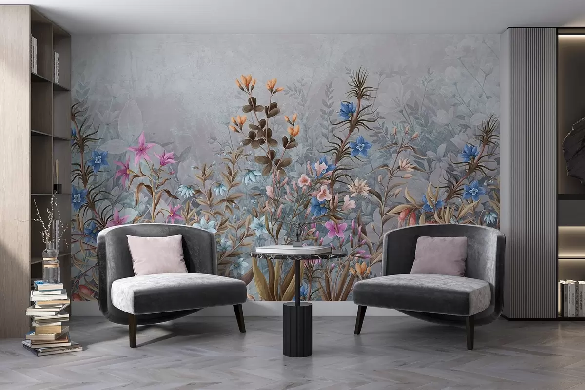 Murais de parede Um estampado floral textural exuberante e vibrante com flores e plantas coloridas com detalhes e texturas intrincados Nr. w08428
