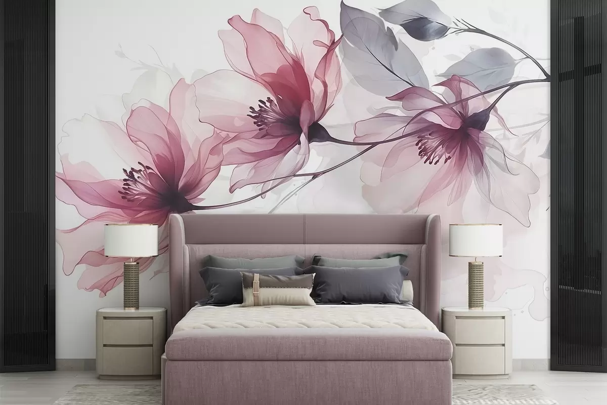 Murais de parede Delicadas flores transparentes cor-de-rosa e cinzentas com pétalas suaves e desfocadas sobre fundo branco Nr. w08429