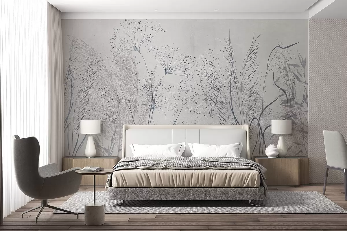 Murais de parede Ilustração monocromática de várias plantas e espiguetas cinzentas com linhas e texturas delicadas e finas Nr. w08441v1