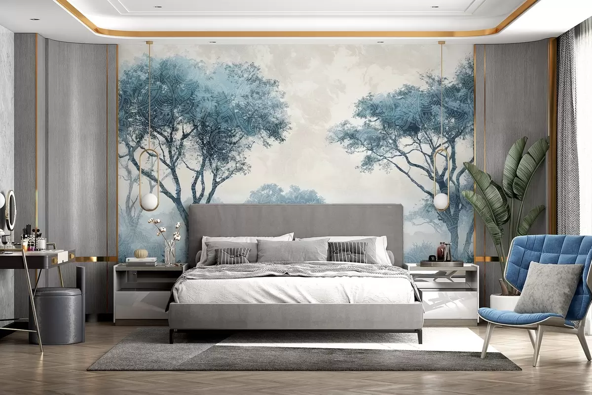 Murais de parede Uma paisagem enevoada e serena com árvores em silhueta em primeiro plano e um nevoeiro suave em tons de azul e bege Nr. w08442