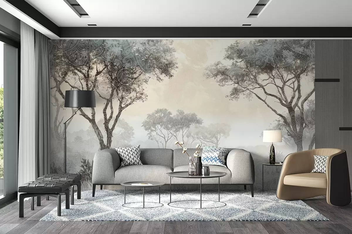 Murais de parede Uma paisagem serena e enevoada com árvores em silhueta em primeiro plano e um nevoeiro suave em tons de cinzento e bege Nr. w08442v1