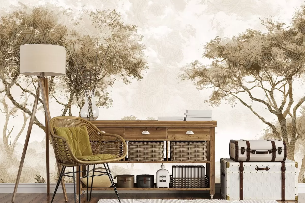 Murais de parede Uma paisagem enevoada e serena com árvores em silhueta em primeiro plano e um nevoeiro suave em tons de castanho e bege Nr. w08442v2