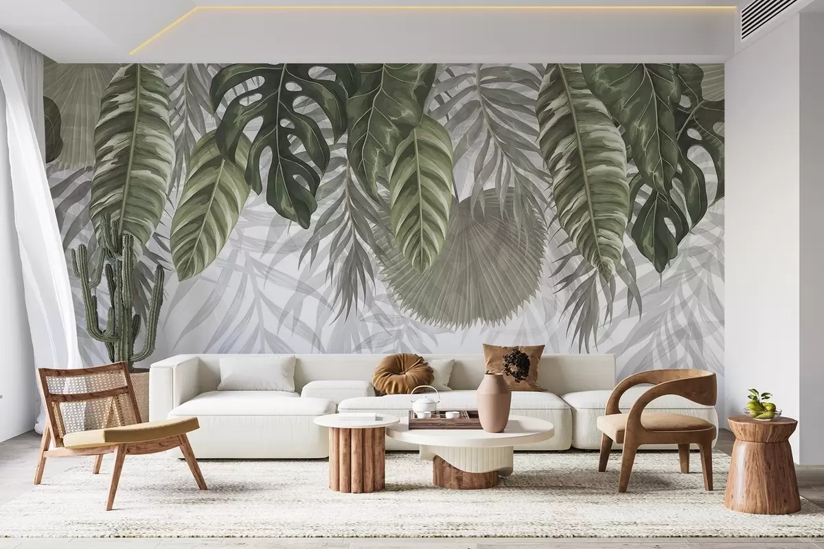 Murais de parede Folhas tropicais em tons de verde, incluindo grandes folhas de monstera e folhas de palmeira sobre fundo branco Nr. w08443