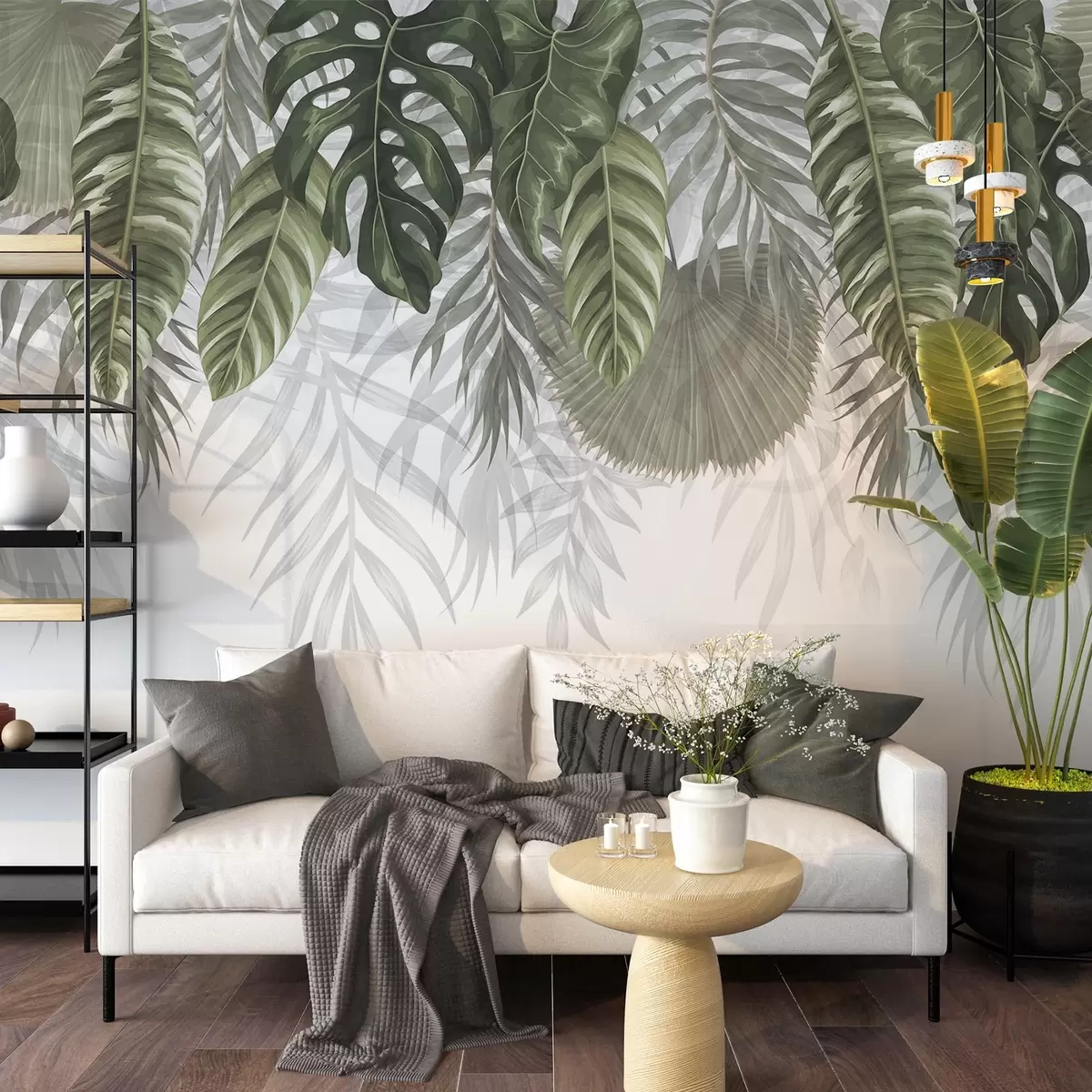Murais de parede Folhas tropicais em tons de verde, incluindo grandes folhas de monstera e folhas de palmeira sobre fundo branco Nr. w08443