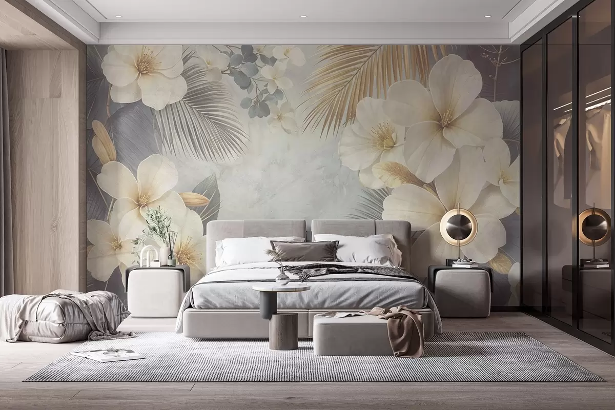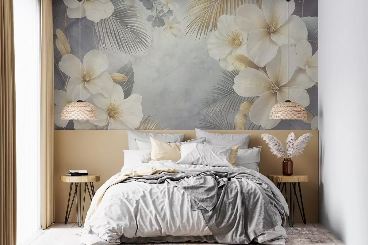 Murais de parede Um padrão floral tropical com grandes flores de hibisco brancas e amarelas, folhas de palmeira em tons suaves de cinzento e bege Nr. w08445