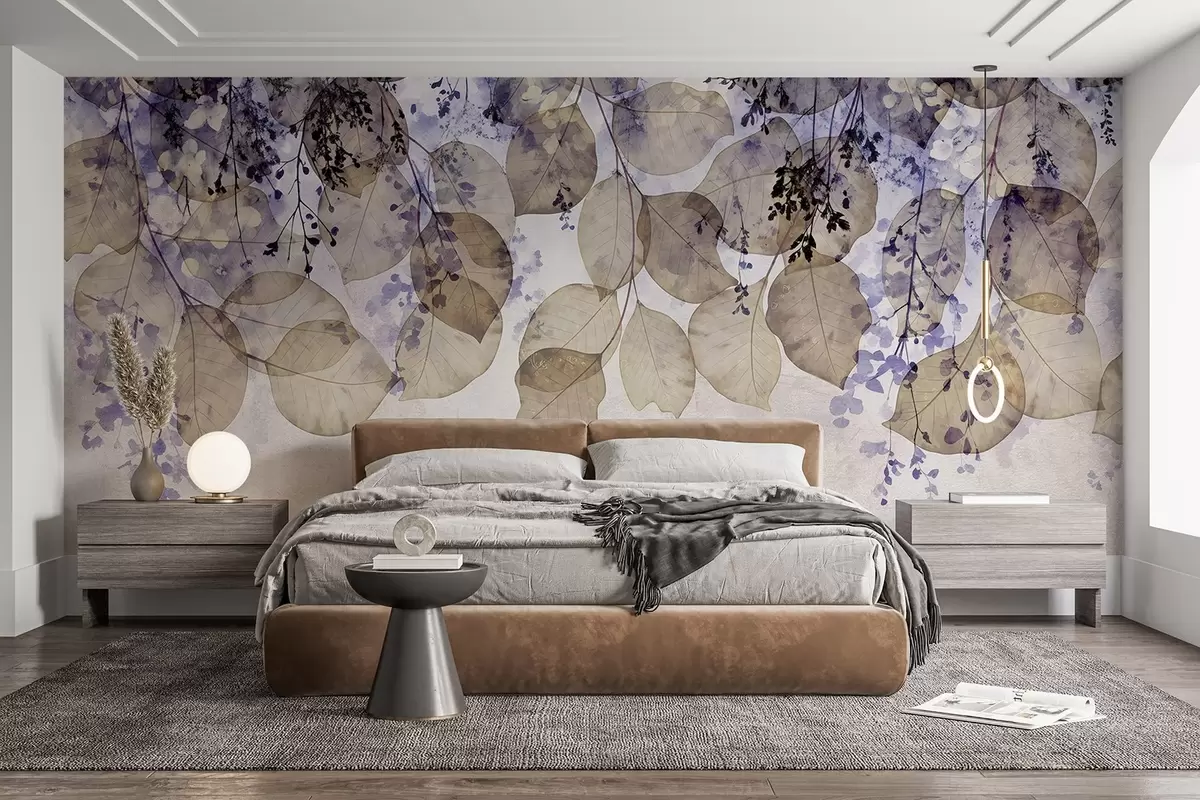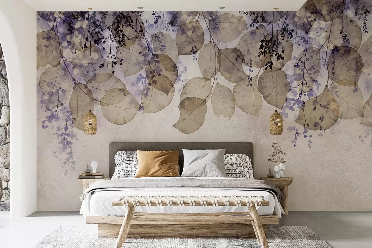 Murais de parede Delicadas folhas secas e flores em tons de púrpura, bege e branco sobre um fundo de textura clara Nr. w08447