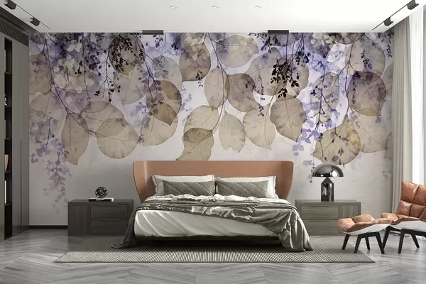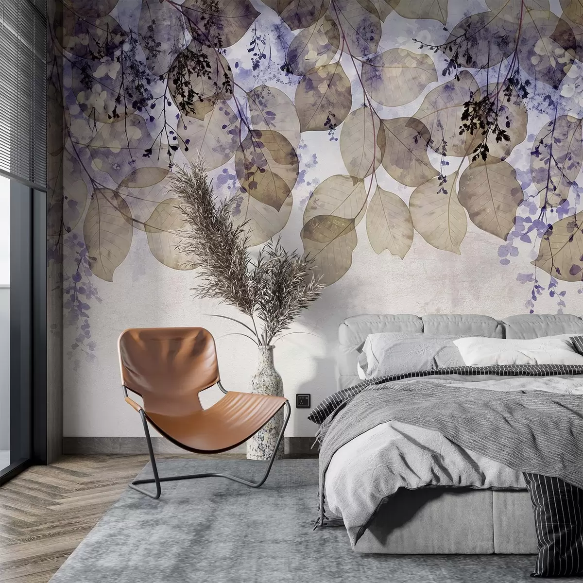 Murais de parede Delicadas folhas secas e flores em tons de púrpura, bege e branco sobre um fundo de textura clara Nr. w08447