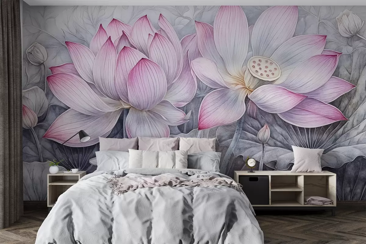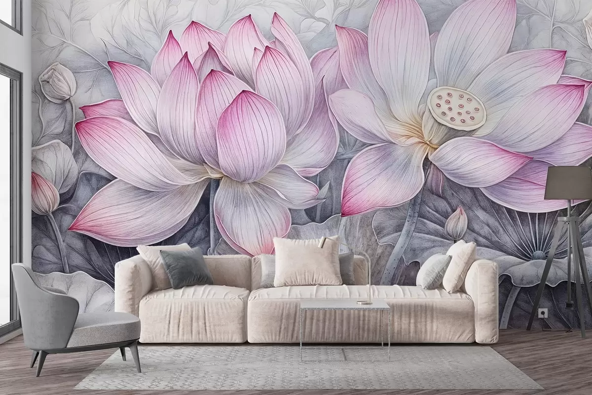 Murais de parede Várias flores de lótus cor-de-rosa grandes com textura pormenorizada, com folhas e caules verde-acinzentados sobre um fundo claro Nr. w08465