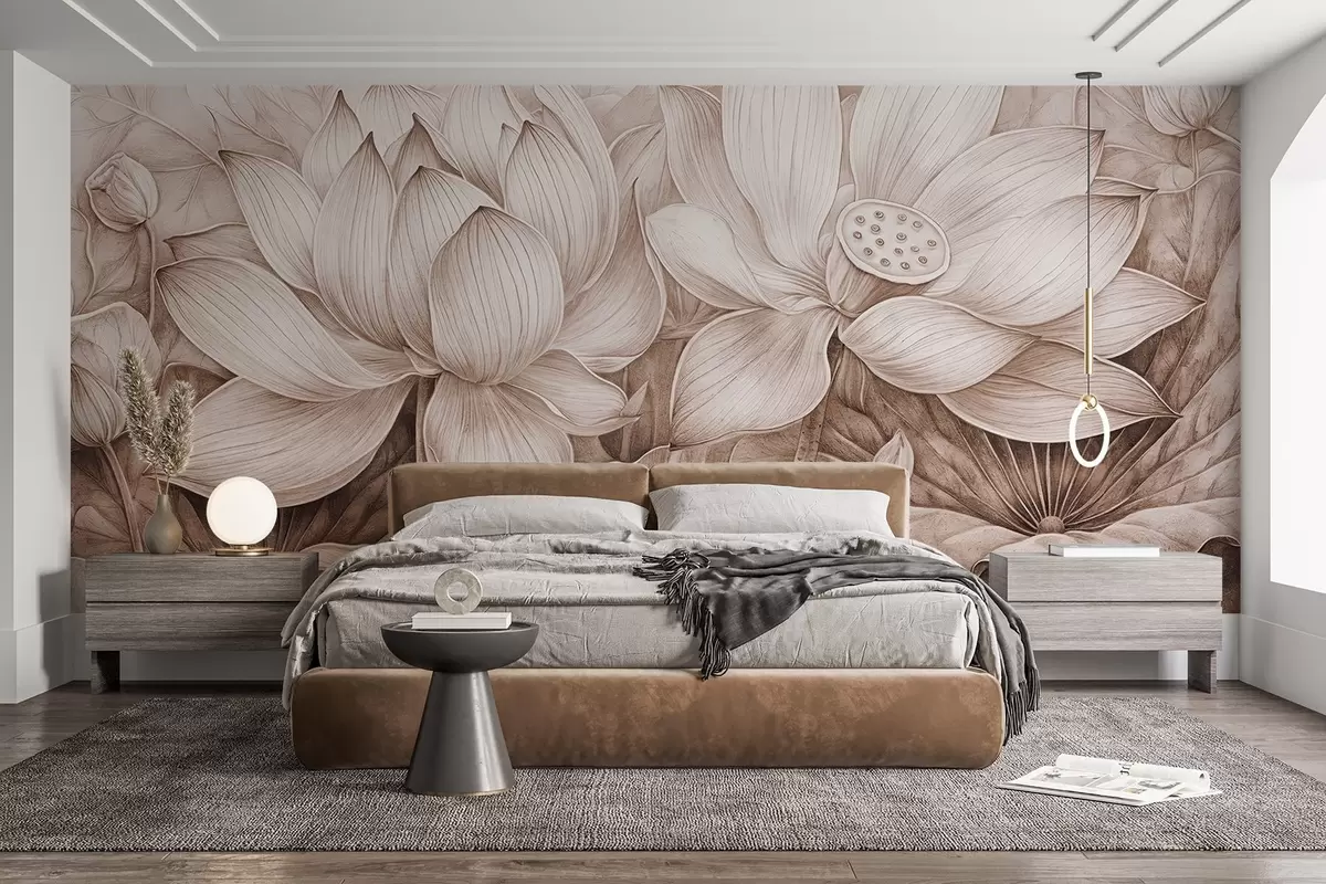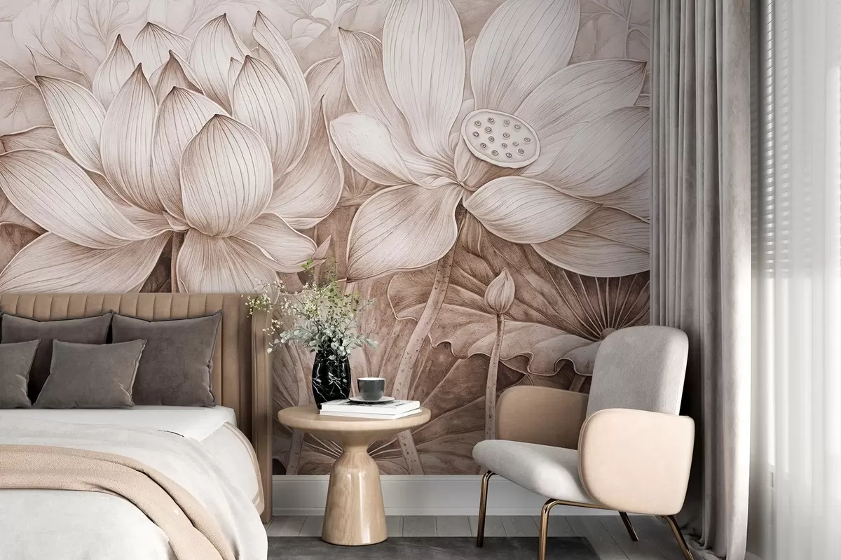 murais de parede Várias flores de lótus bege grandes com textura pormenorizada, com folhas e caules castanhos sobre um fundo claro w08465v1