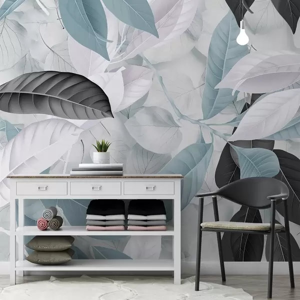 Murais de parede Impressão grande de folhas azuis e cinzentas sobre um fundo texturado de folhas claras, criando um ambiente tropical exuberante Nr. w08468v1