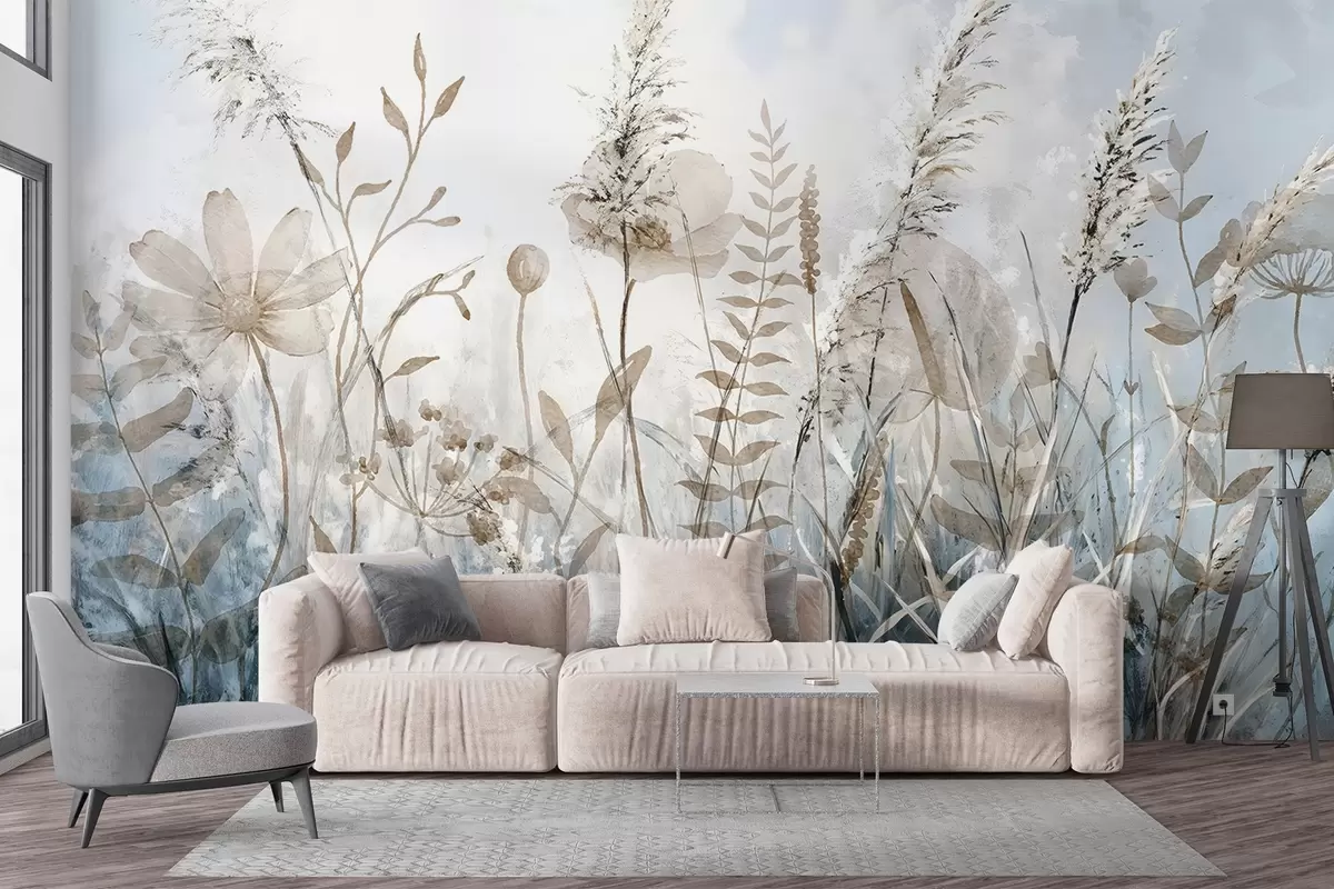 Murais de parede Um campo de relva alta, folhagem natural e plantas com texturas suaves e finas contra um céu enevoado e nublado Nr. w08472