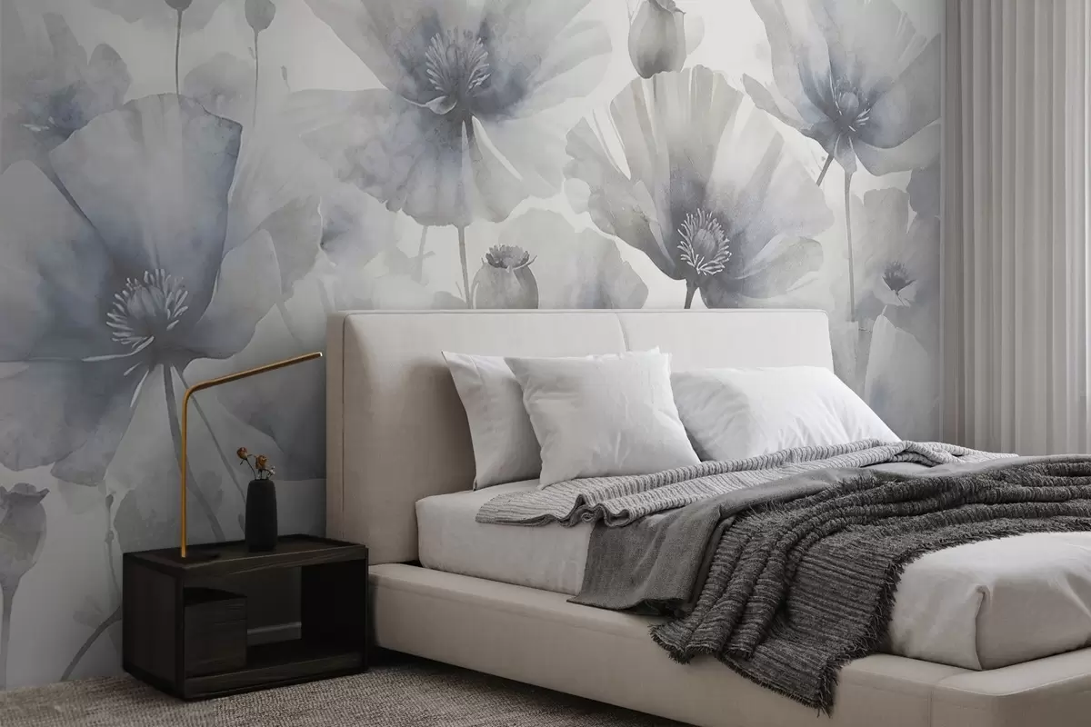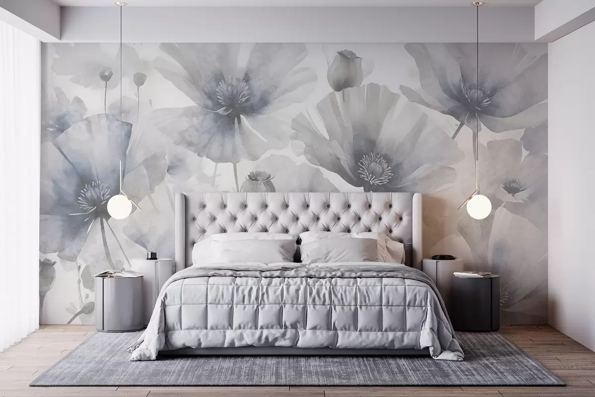 Murais de parede Flores delicadas de textura grunge cinzenta e branca com pétalas suaves e desfocadas sobre um fundo branco Nr. w08526