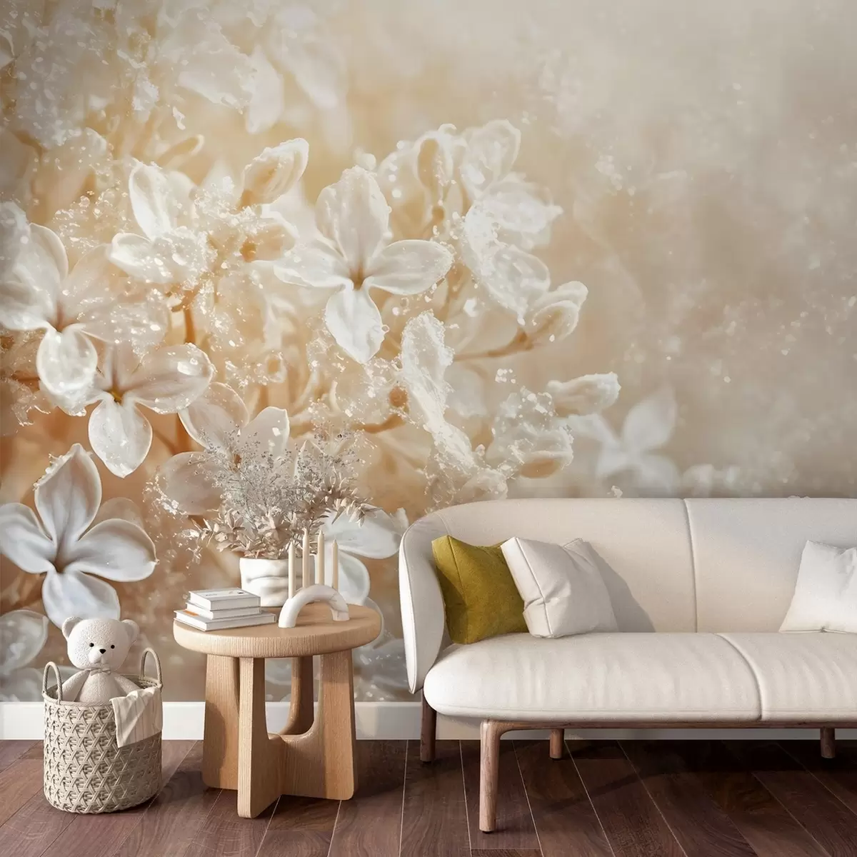 Murais de parede Delicadas flores lilases brancas com fundo amarelo suave e desfocado Nr. w08533