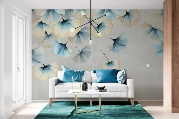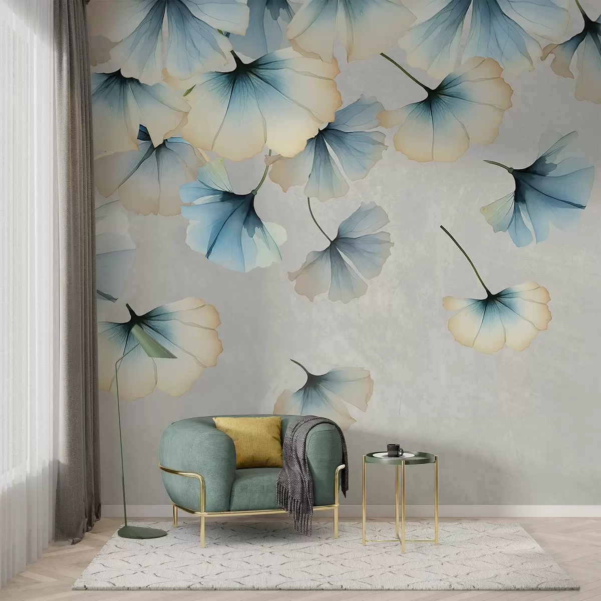 Murais de parede Folhas de ginkgo azuis e amarelas em tons pastel com pétalas delicadas a flutuar no ar sobre um fundo textural Nr. w08578v1