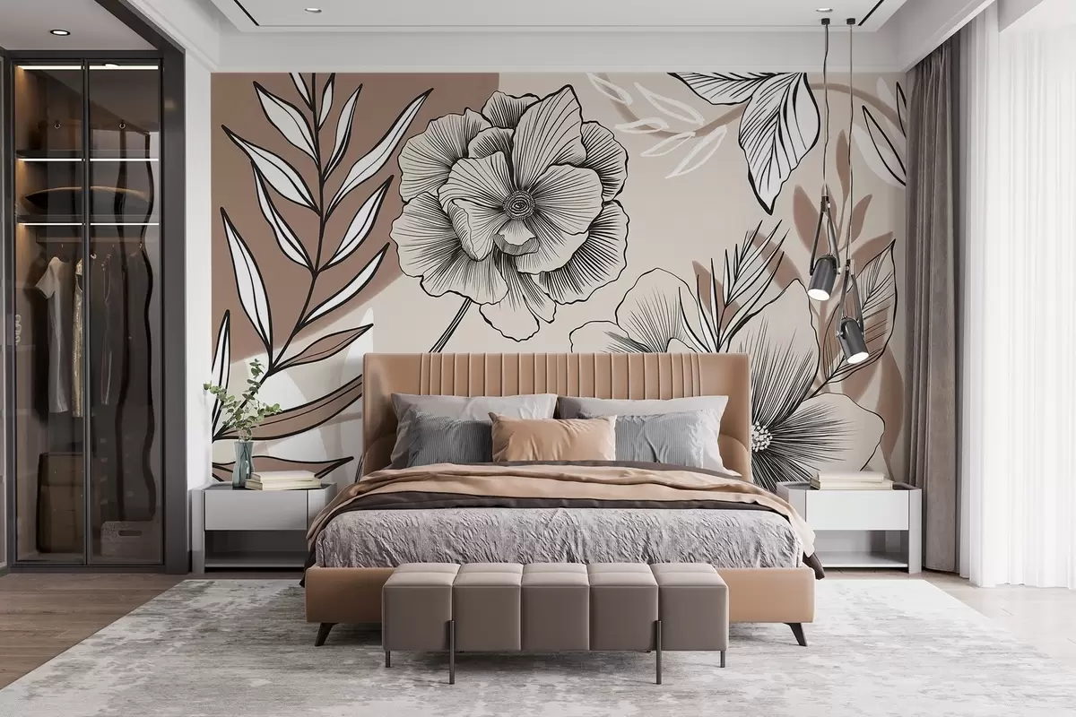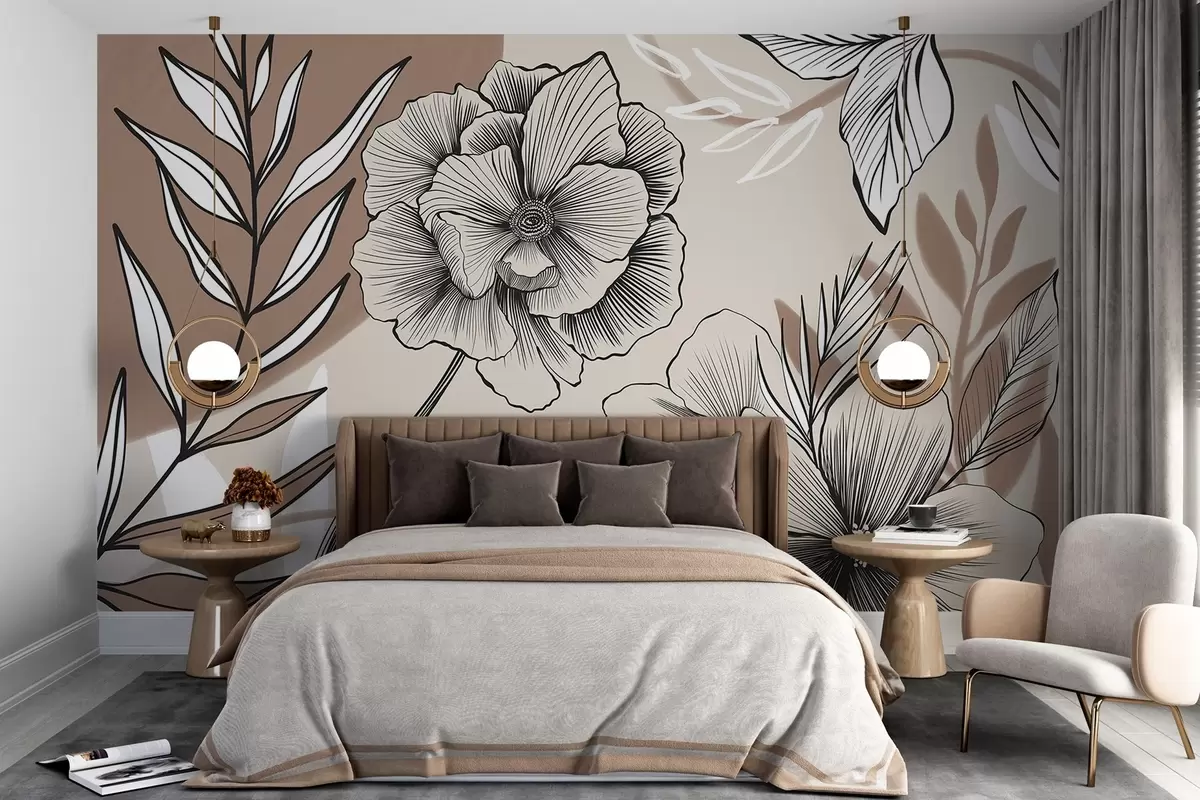 Murais de parede Grandes flores gráficas a preto e branco com folhas pormenorizadas sobre um fundo abstrato bege Nr. w08580