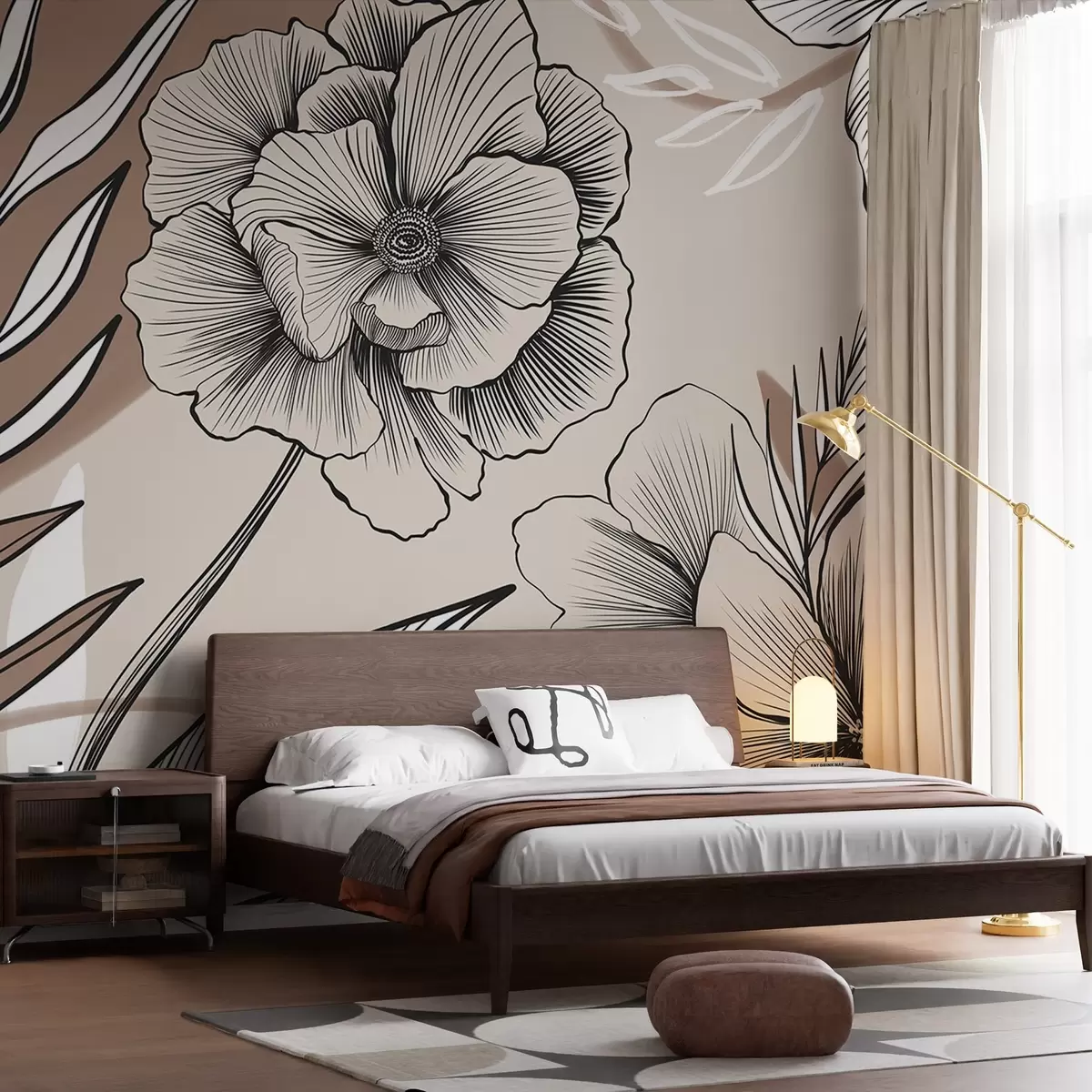 Murais de parede Grandes flores gráficas a preto e branco com folhas pormenorizadas sobre um fundo abstrato bege Nr. w08580