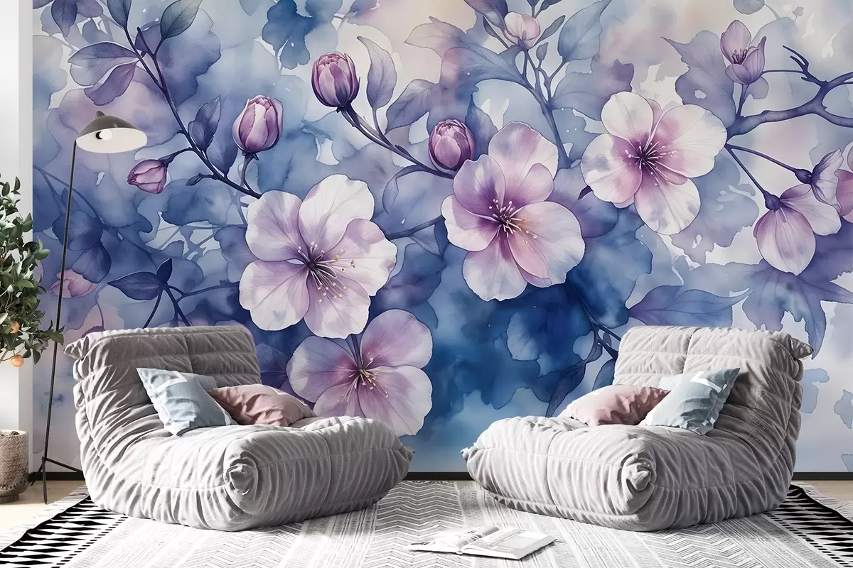 Murais de parede Delicada aguarela que imita flores cor-de-rosa e roxas com pétalas suaves e esbatidas sobre um fundo azul Nr. w08582