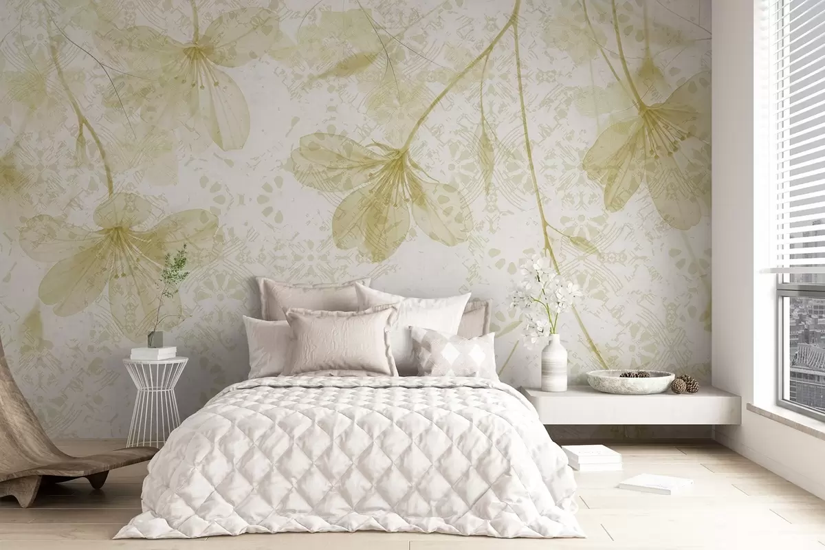 Murais de parede Delicadas flores amarelas e brancas com longos caules e pétalas sobre um fundo textural suave e desfocado Nr. w08588v2