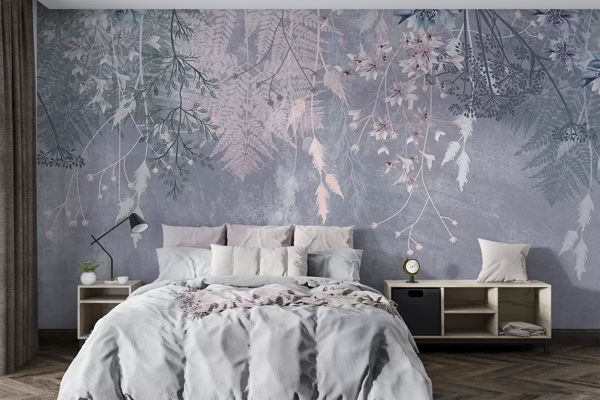 Murais de parede Plantas, espiguetas e flores delicadas e sonhadoras em tons pastel azuis sobre um fundo nebuloso e texturado Nr. w08606