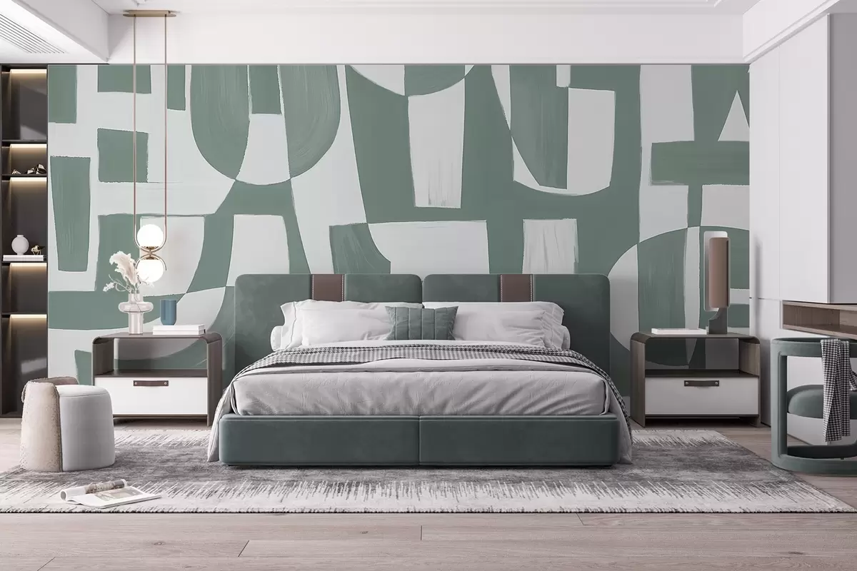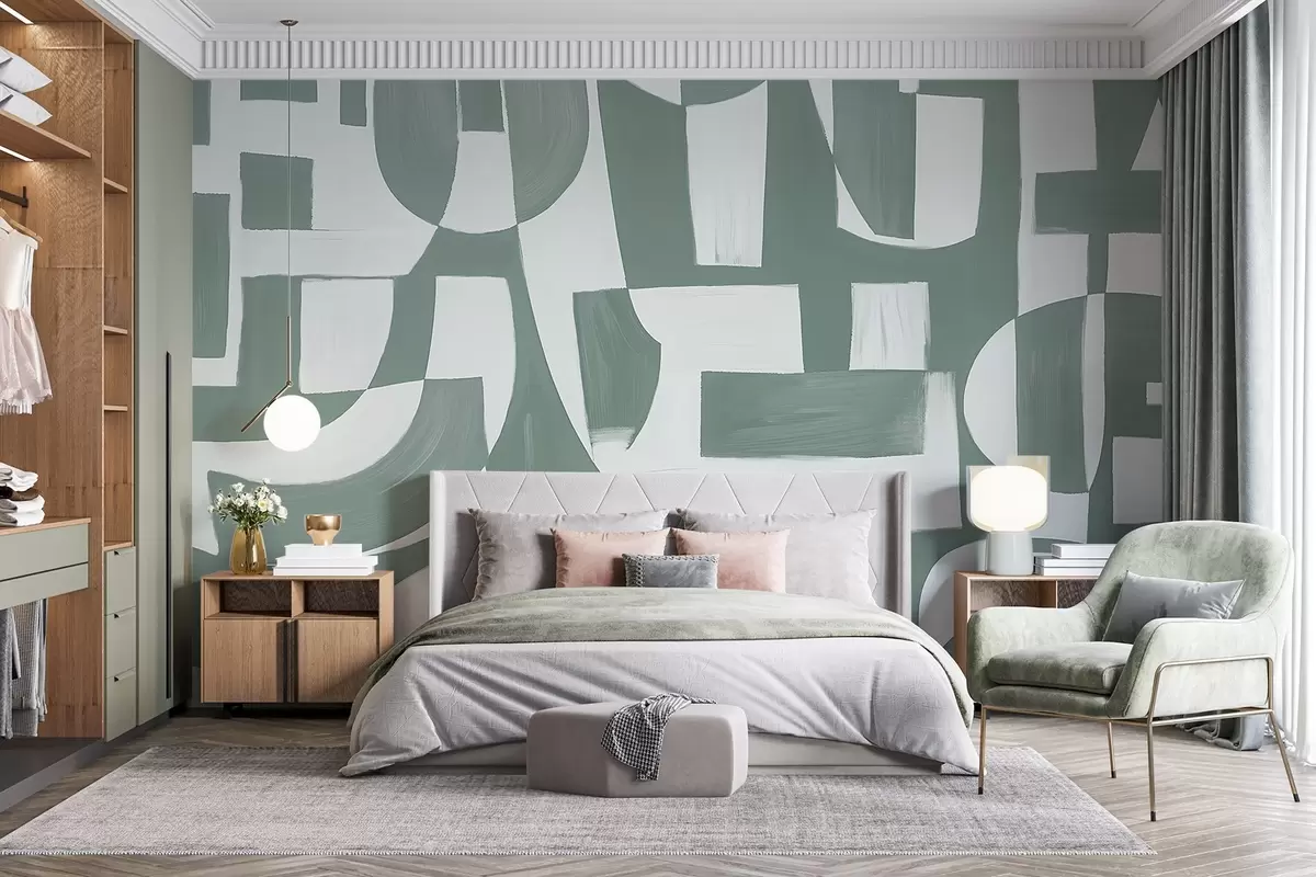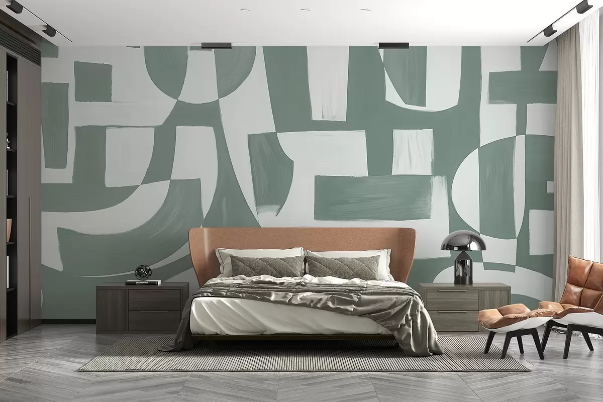 Murais de parede Formas e padrões geométricos abstractos em verde e branco, criando uma composição visualmente marcante e dinâmica Nr. w08608v1