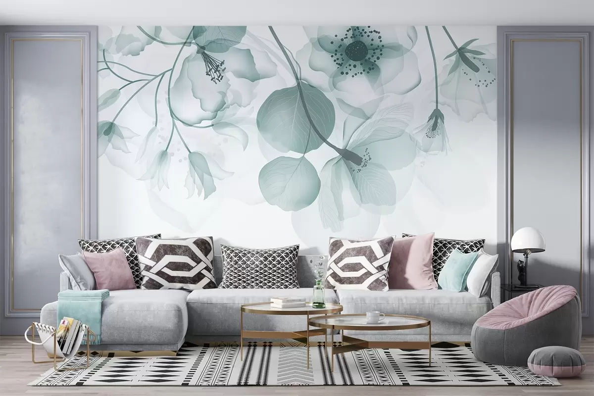 Murais de parede Delicadas flores translúcidas turquesa com pétalas suaves e centros escuros, sobre um fundo claro Nr. w08613v1