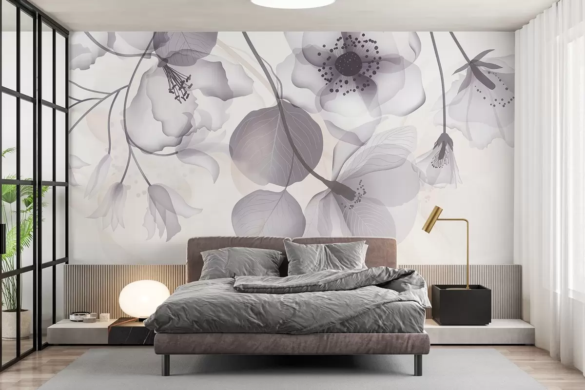 Murais de parede Delicadas flores translúcidas cinzentas e beges com pétalas suaves e centros escuros, sobre um fundo claro Nr. w08613v2