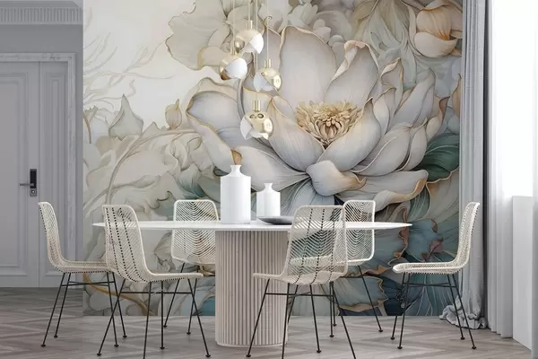 Murais de parede Uma grande e delicada flor de lírio branco e folhagem com pétalas decorativas suaves e em camadas sobre um fundo abstrato com textura azulada Nr. w08640