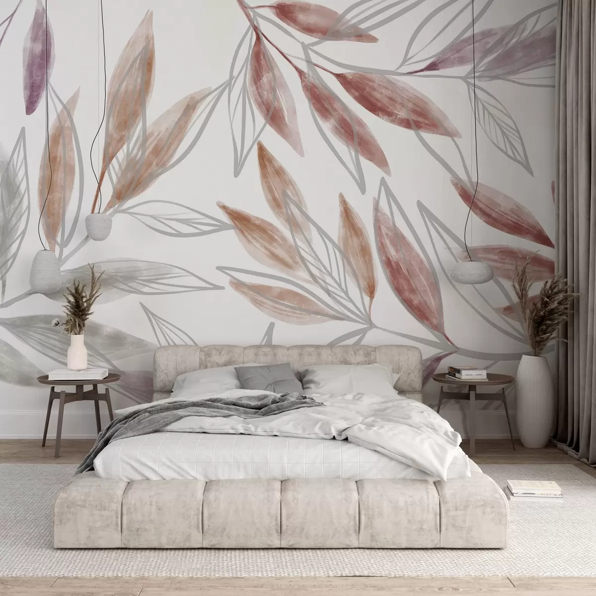 Murais de parede Folhas delicadas em tons pastel com textura rosa e cinzenta, criando uma composição botânica serena e minimalista Nr. w08642