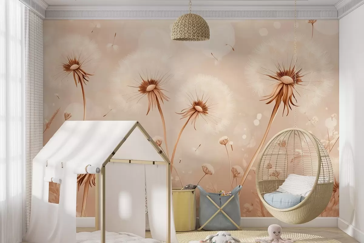 Murais de parede Dentes-de-leão e flores silvestres elegantes em estilo de pintura em tons quentes Nr. w08657