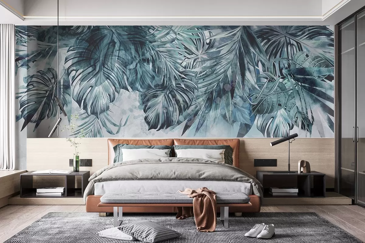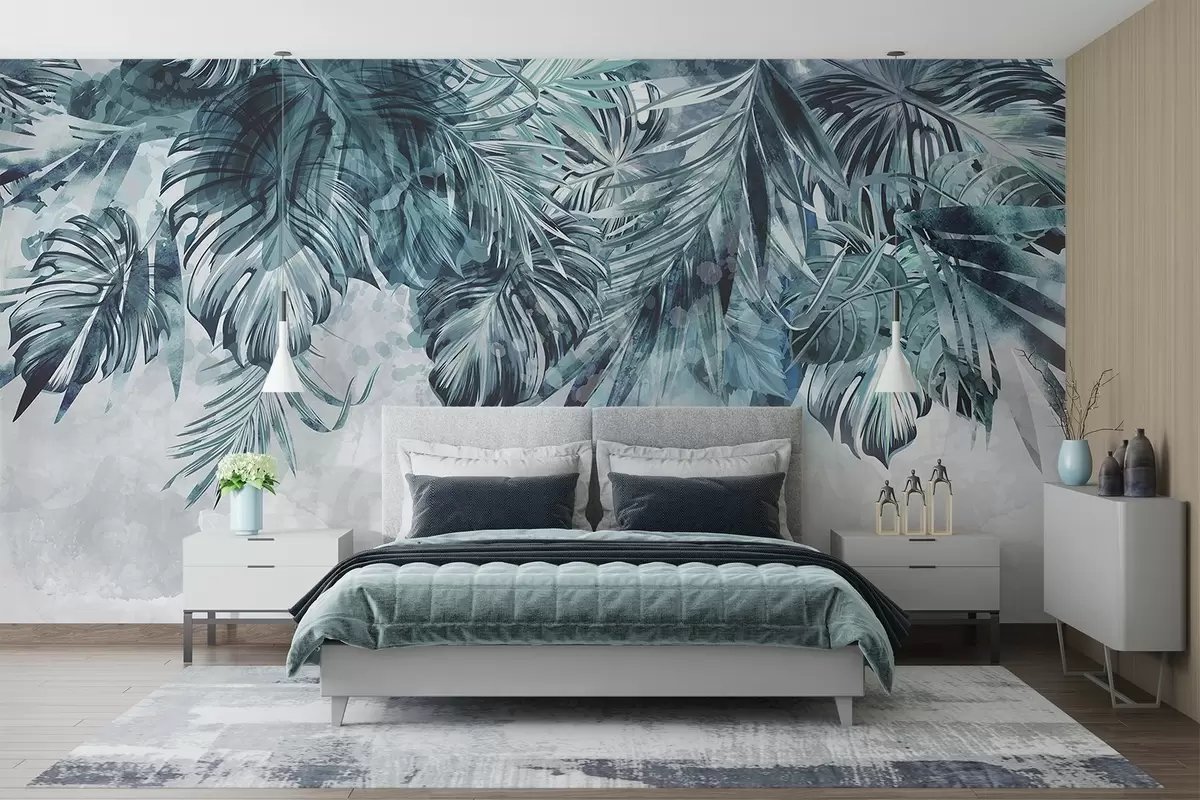 Murais de parede Folhas tropicais em tons de azul-petróleo e verde, em cascata a partir do topo, sobre um fundo leve e texturado Nr. w08667