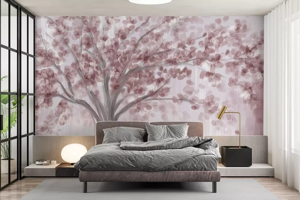 Murais de parede Uma árvore grande com folhas suaves e abstractas em cor-de-rosa sobre um fundo claro e neutro que realça os tons da árvore Nr. w08669v2