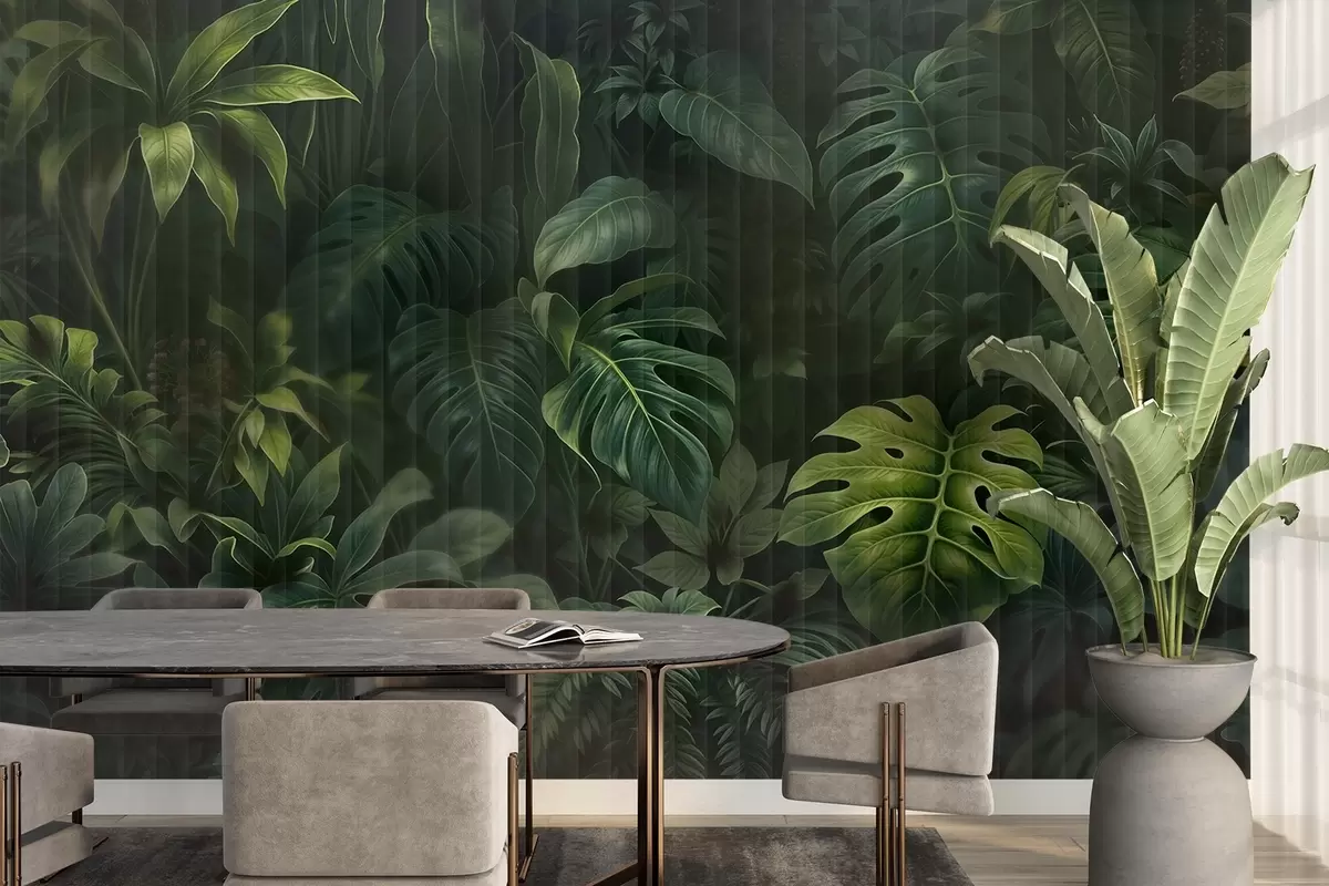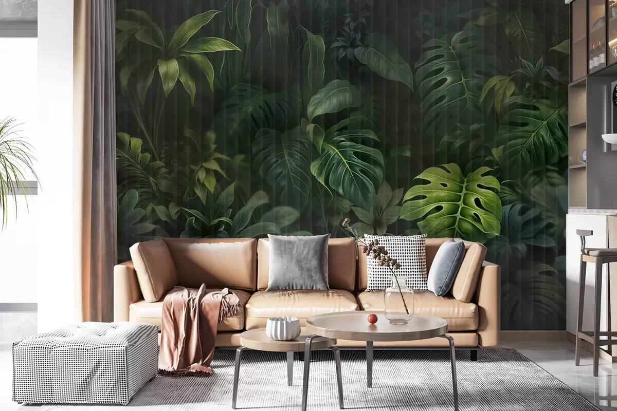 Murais de parede Estampa tropical escura esbatida e texturada com várias folhas verdes, incluindo monstera e folhas de palmeira Nr. w08673