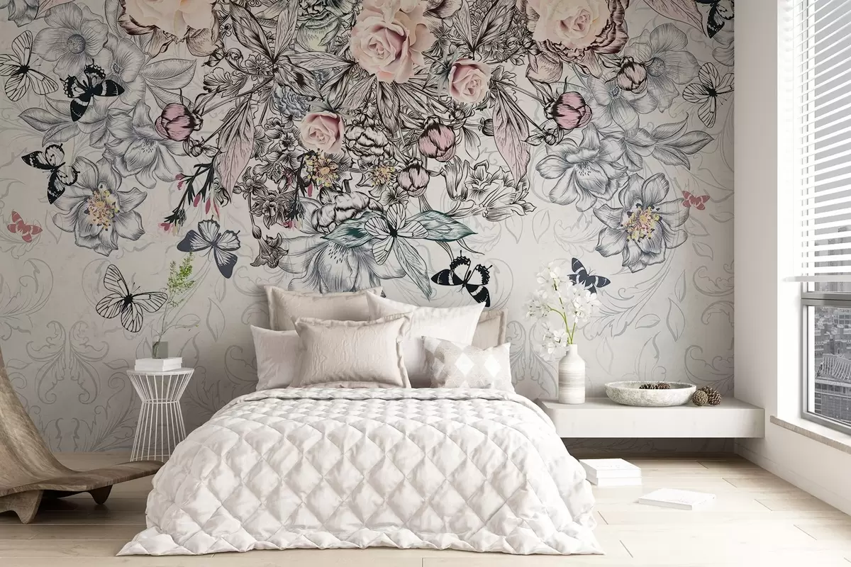 Murais de parede Um desenho floral com rosas cor-de-rosa e várias flores e borboletas com linhas de arte complexas sobre um fundo texturado Nr. w08674