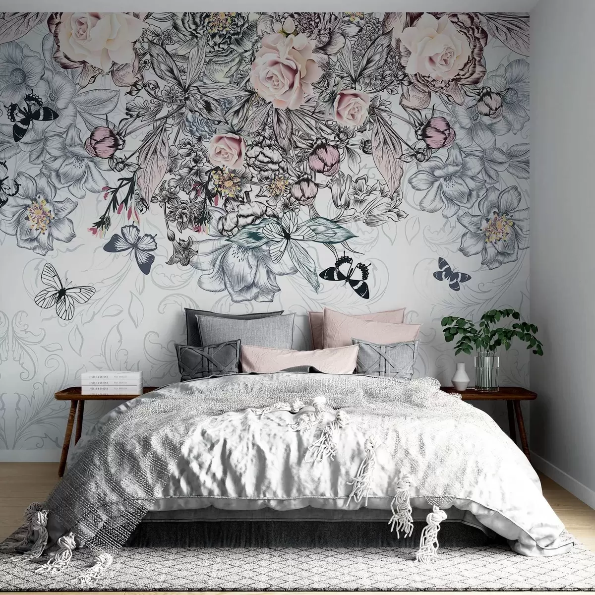 Murais de parede Um desenho floral com rosas cor-de-rosa e várias flores e borboletas com linhas de arte complexas sobre um fundo texturado Nr. w08674