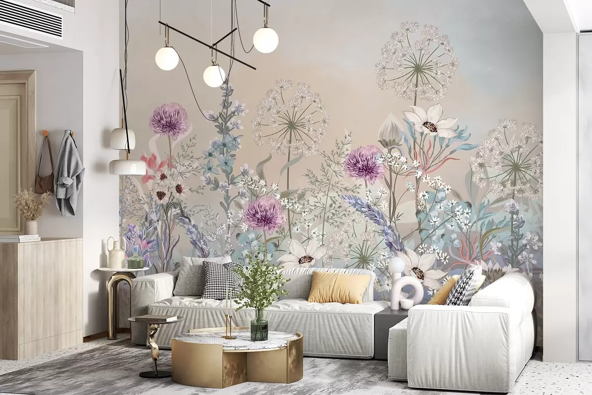 Murais de parede Um jardim floral vibrante com várias flores e relva num fundo texturado de gradiente de cor pastel suave Nr. w08699
