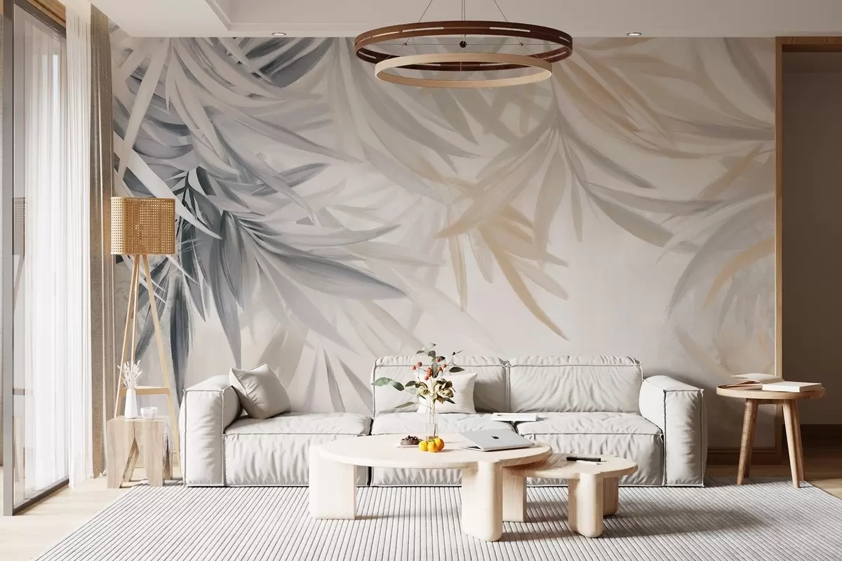 Murais de parede Folhas tropicais suaves e fluidas de cor clara em tons de cinzento e pêssego, que se misturam num estampado pálido e neutro Nr. w08703