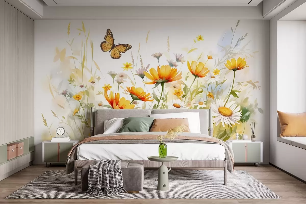 murais de parede Um campo de flores vibrante, semelhante a uma aguarela, com flores cor de laranja e amarelas e uma borboleta por cima das flores w08739