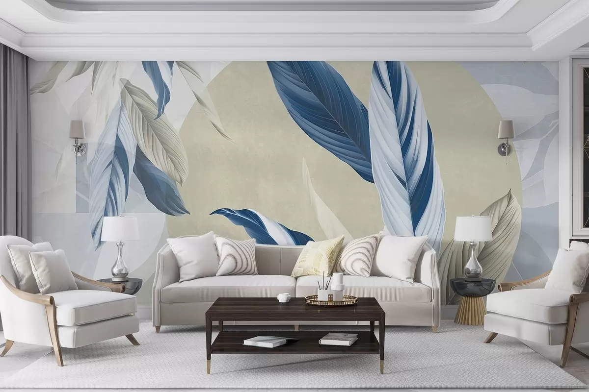 Murais de parede Composição geométrica textural moderna e abstrata com folhas detalhadas em tons de azul, bege e branco Nr. w08741