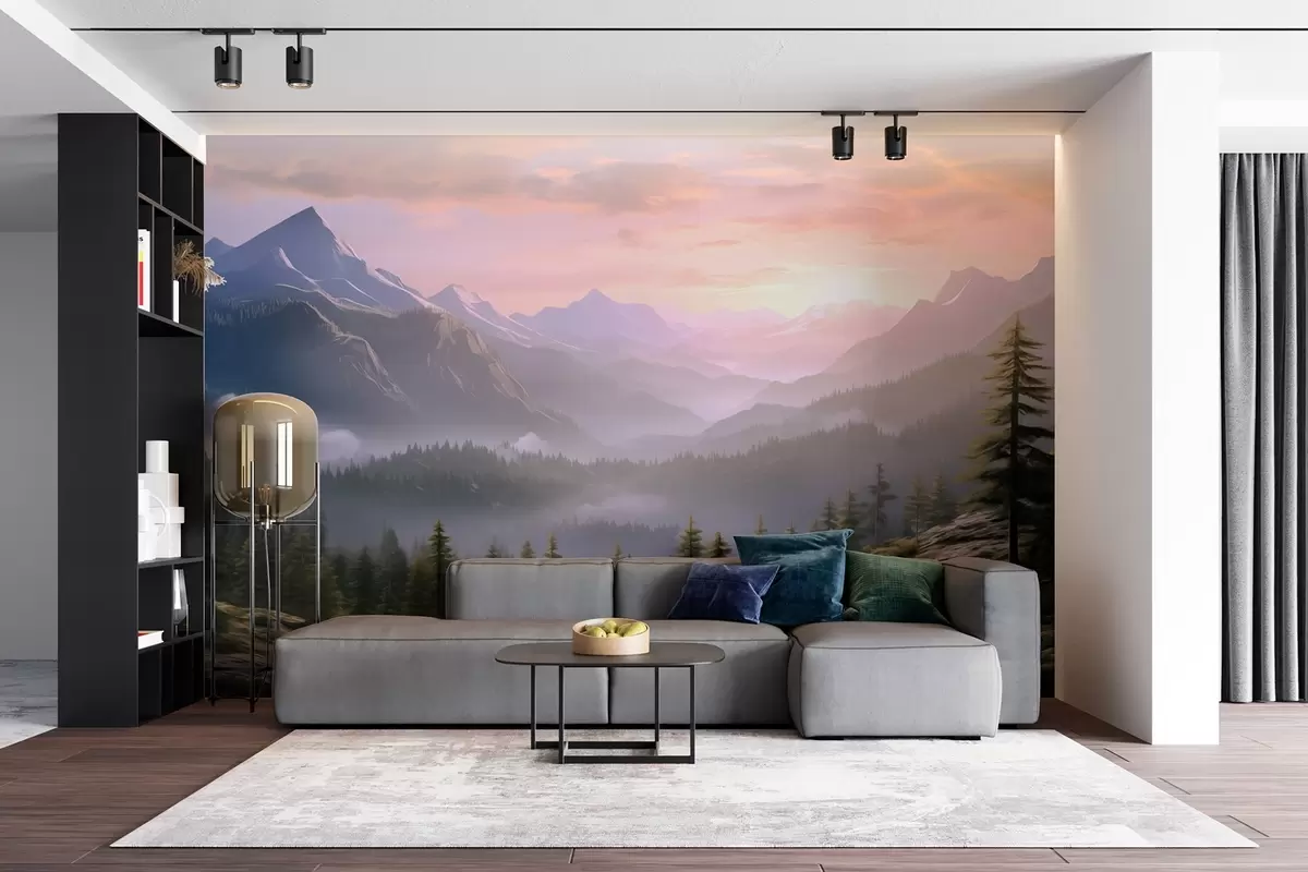 Murais de parede Paisagem serena de montanha ao amanhecer com uma névoa suave num cenário de floresta Nr. w08750