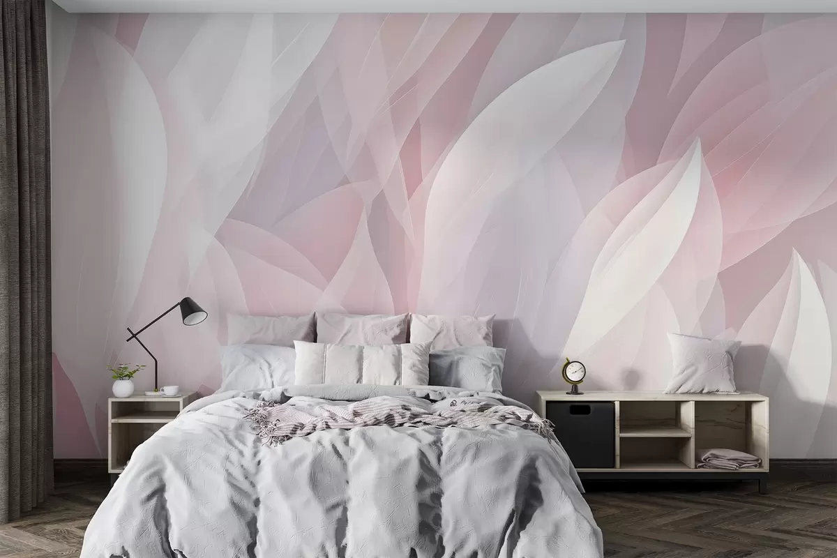 Murais de parede Desenho abstrato com formas suaves de pétalas em tons de rosa e branco, criando um efeito de camadas Nr. w08774