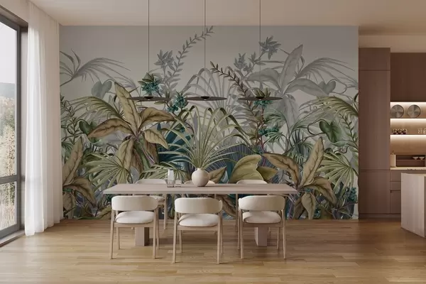 Murais de parede Arranjo de várias plantas tropicais com folhas grandes e vibrantes, criando um cenário de folhagem exuberante num fundo bege claro Nr. w08777v1