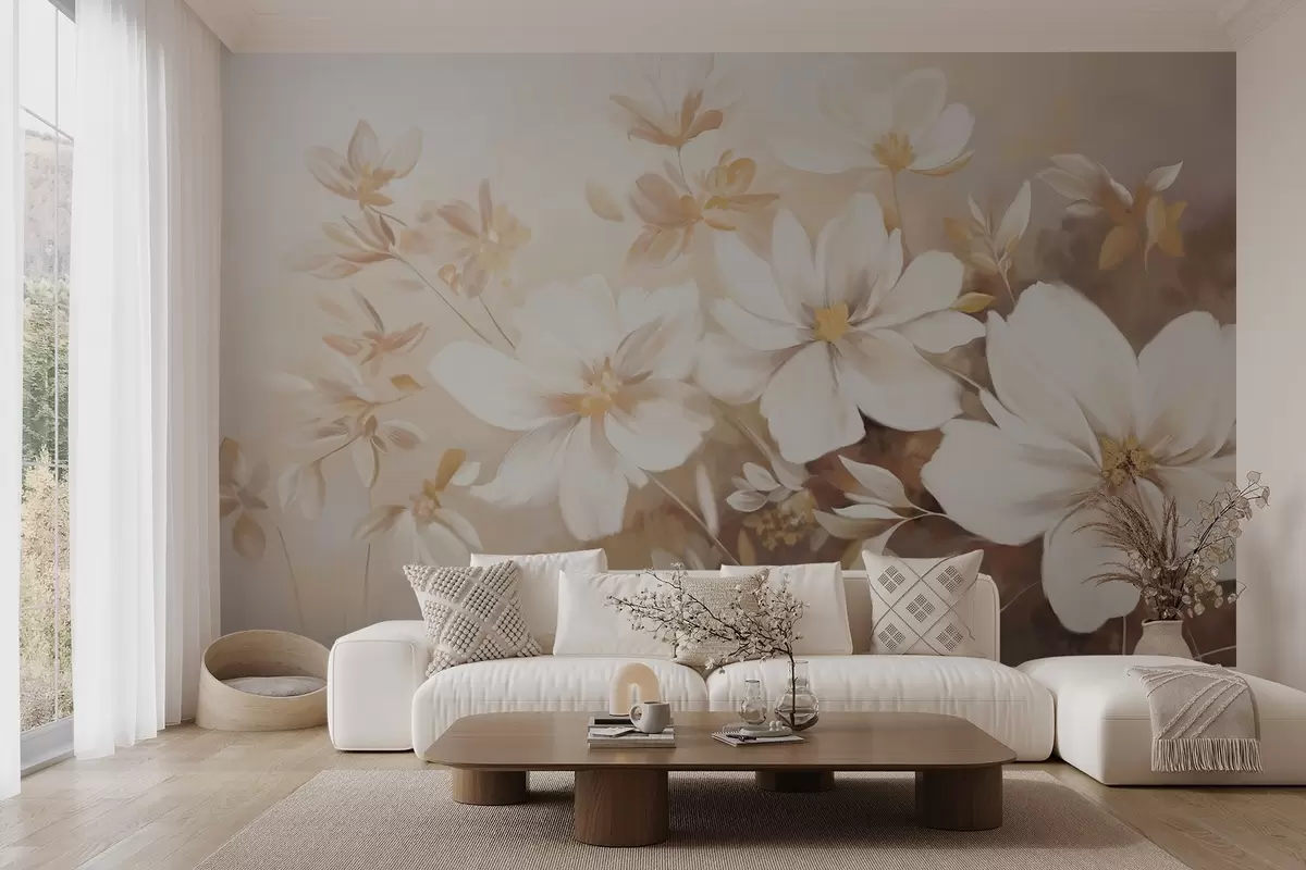 Murais de parede Flores pintadas de branco com pétalas suaves e folhas delicadas, sobre um fundo bege claro e creme Nr. w08780