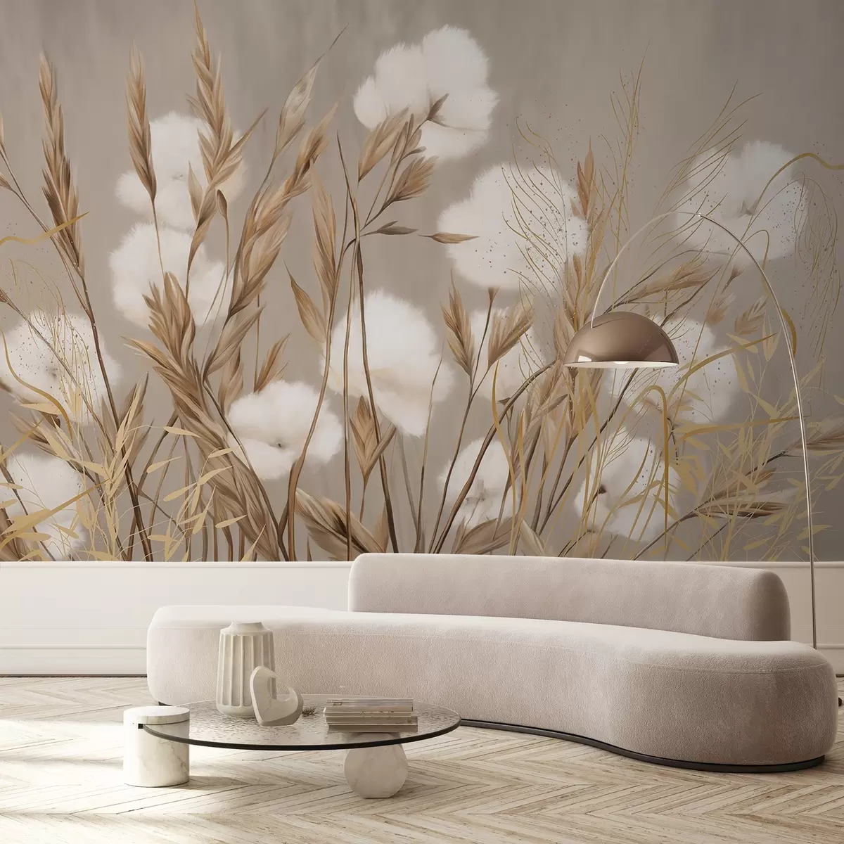 Murais de parede Flores brancas de algodão macio e fofo e ervas altas com espiguetas cor de laranja num fundo bege com uma textura suave Nr. w08784